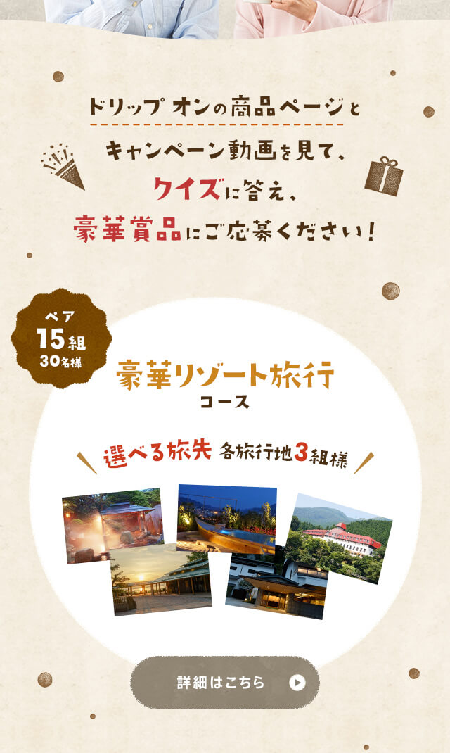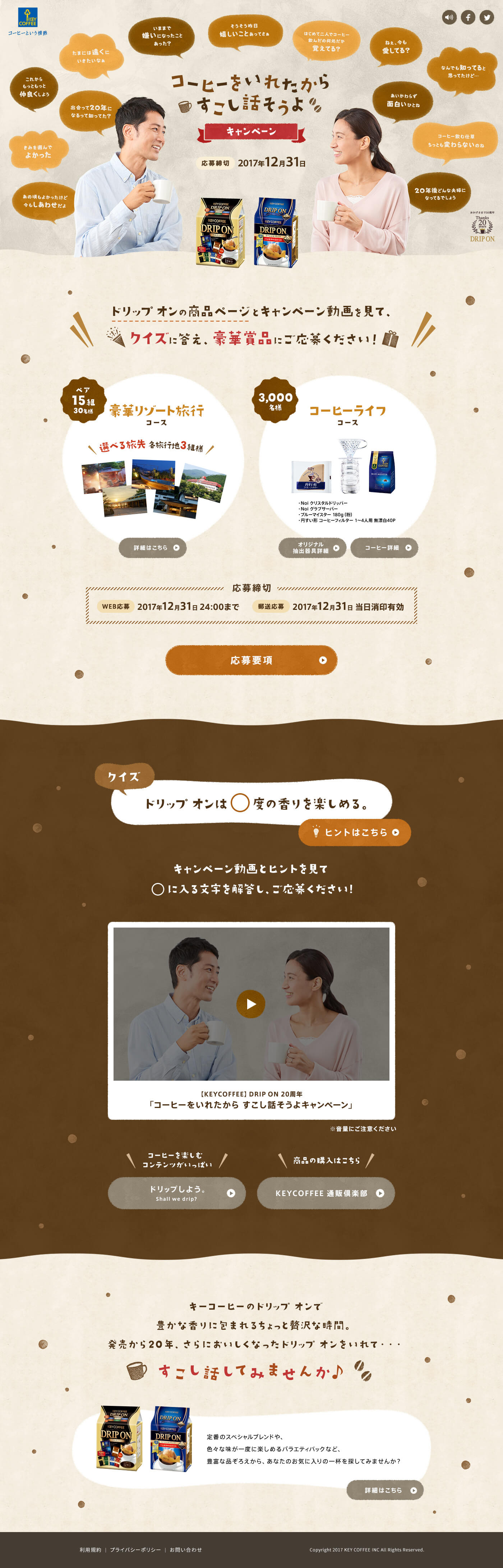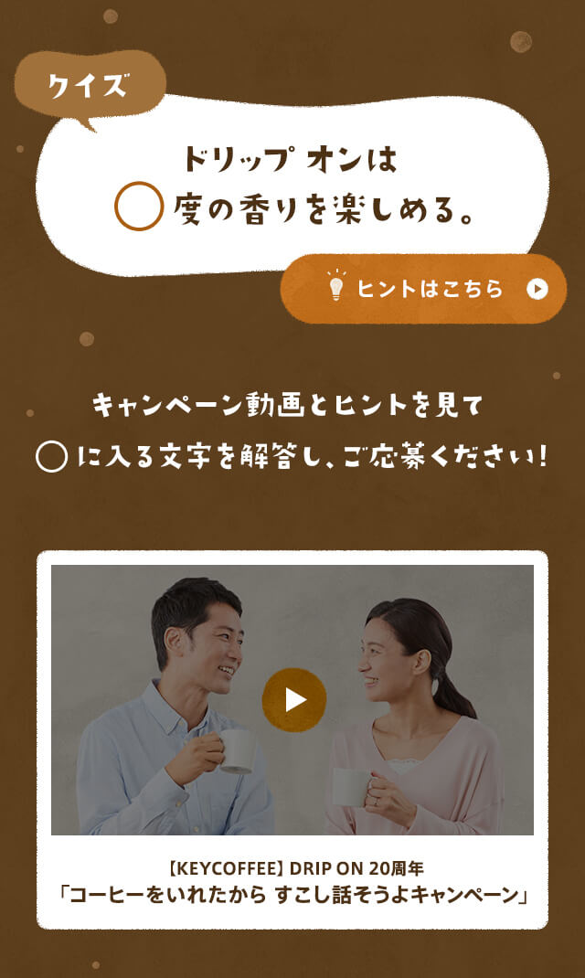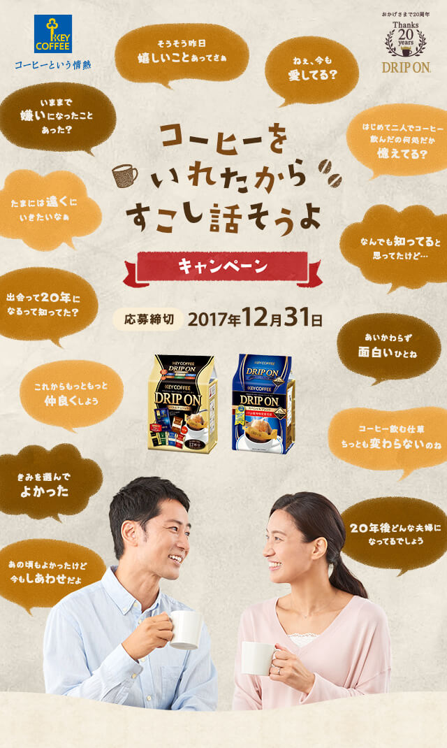 - キーコーヒー「ドリップ オン」発売20周年記念「コーヒーをいれたから すこし話そうよ キャンペーン」のアートディレクション、WEBデザイン、応募はがきデザインを担当しました。